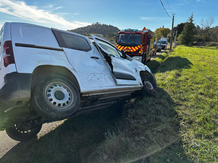 *INTERVENTION* 14 novembre 2023 : A Montségur Sur Lauzon, cette voiture est en mauvaise posture. Un seul blessé léger à déplorer. Les secours du secteur ont été renforcés par le FPTSR et le VSEC de St Paul 3 C.